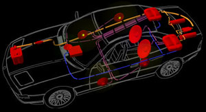 | Run power cables (yellow) on one side of the vehicle and RCA cables (blue) on the opposite side to reduce noise induction. |