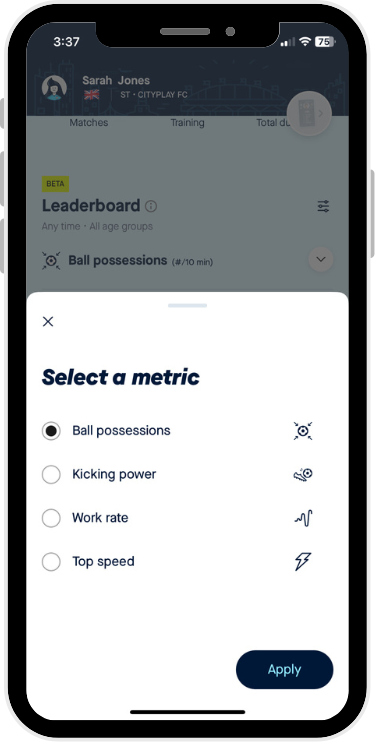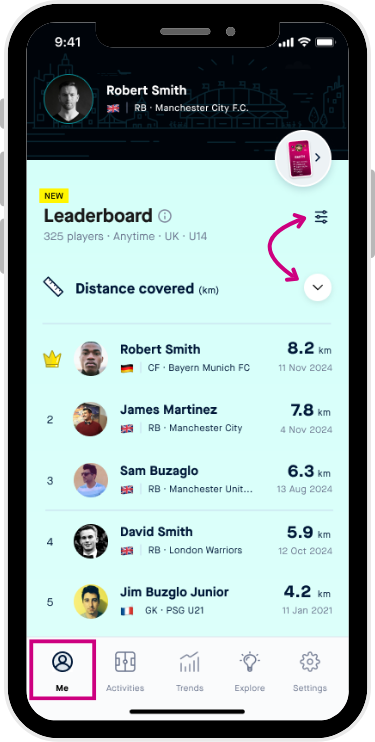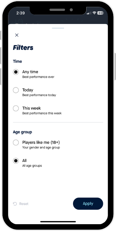 - You can filter your Leaderbords by time and age groups by clicking the filter icon