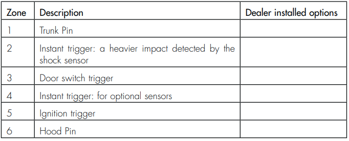 The in-vehicle status LED indicates which zone was involved. (See ‘Table of Zones’ section of this guide.) The system retains this information in its memory and continues to chirp four or five times each time it is disarmed, until the next time the ignition is turned on.