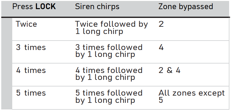 Multi-Level Security Arming allows you to select which of the security system’s inputs or sensors are active, or are bypassed when the system is armed. Press the lock button once to arm the system, and then again to activate multi-level security arming. See the guide below.
