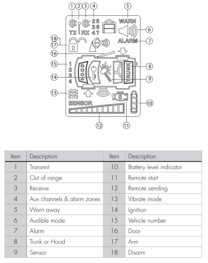 Your 2-way remote control can operate up to four vehicles with full command capability for all vehicles. To change the Vehicle to be operated: Press the button on the back for one second then release, each time the button is released the vehicle control indicator will change. While the system is armed, if the Warn Away or full alarm is triggered on any of the programmed vehicles, that vehicle’s number will be displayed and the LCD will display that vehicle’s status. To change back to the original vehicle that was selected press the button for one second and release until the desired vehicle number is shown.