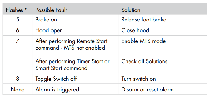 For user safety, the system must be properly configured or remote start will not activate. A Remote Start Fault may be caused by any of several configuration issues. If the remote start fails to activate, refer to the table below for the command type and parking light flashes that will identify the configuration issue and solution.