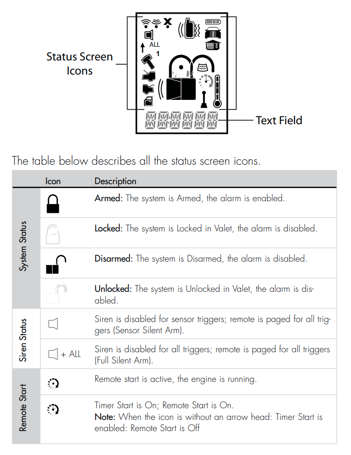 The text field can be set to display the information you prefer during remote start. RUNTIME: Remote Start Runtime, TEMP: vehicle interior Temperature, or the CLOCK will be displayed in the text field while Remote Start is on.