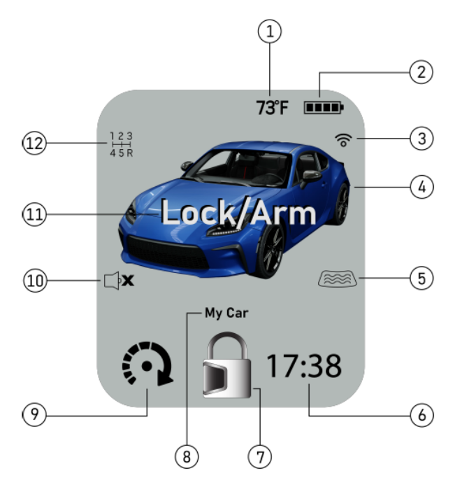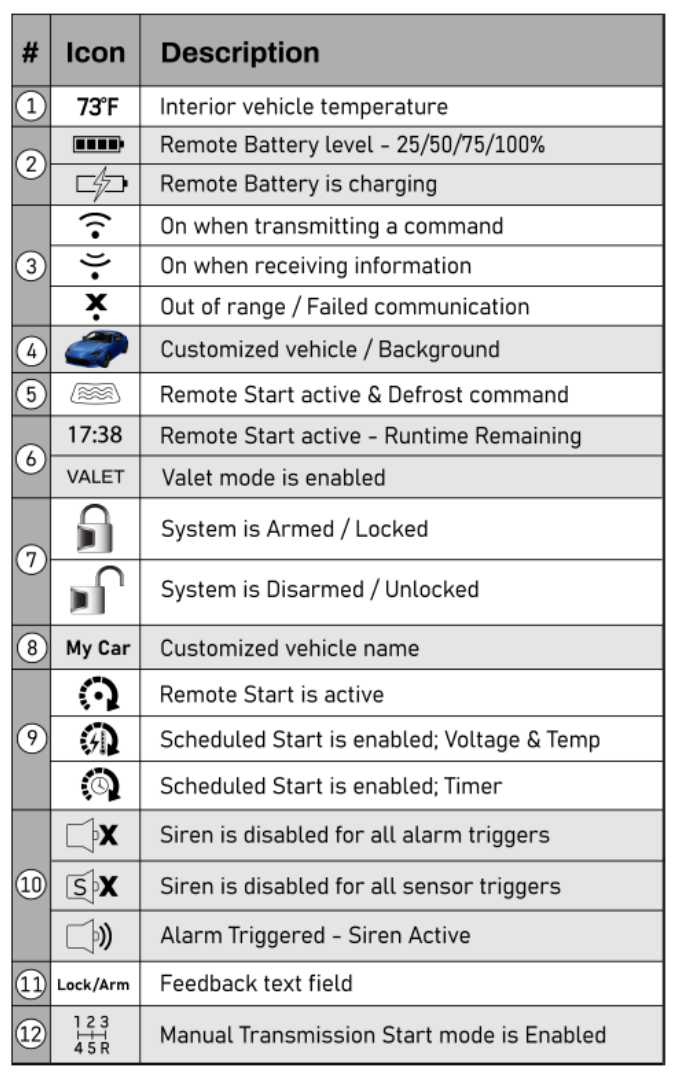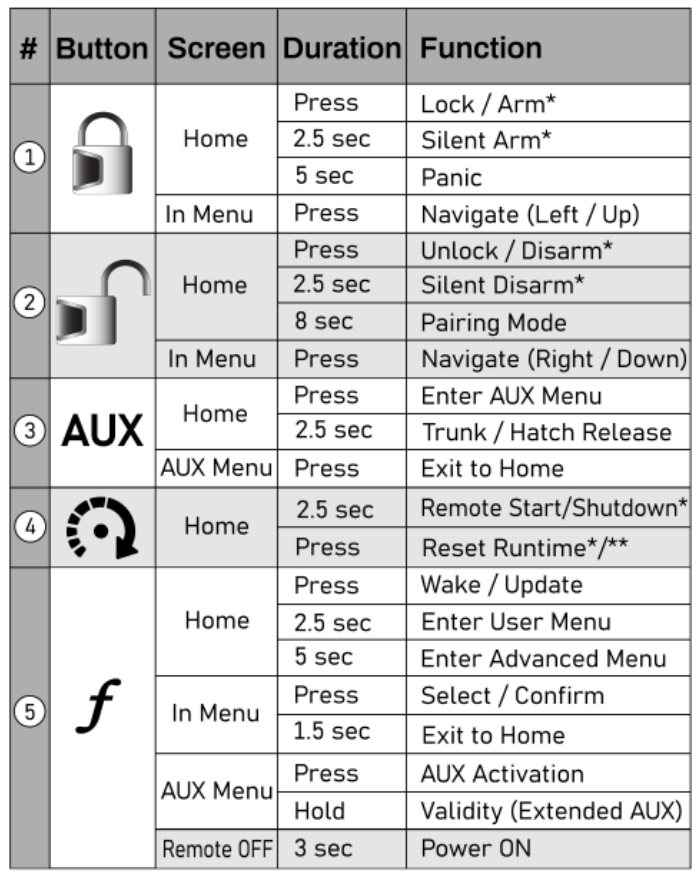 The companion 1 way remote commands the system features as shown in the previous table, but without the message display of the Responder LC remote. Siren chirps and parking light flashes are used to indicate that a command has been received and activated as described in the Basic and Advanced command sections.
