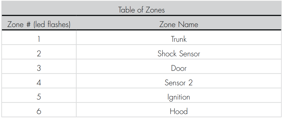 When armed by remote command the system runs a status check of the alarm trigger zones. Faulty zones (usually caused by dome light delay or open trunk) are bypassed and reported via the control center LED, while all other trigger zones remain active and are monitored to protect the vehicle. Should a faulty zone self correct (dome light turns off) it becomes active and is then monitored normally. The siren chirps once again a few seconds following the arming chirps as an audible alert, the control center LED flashes in groups to indicate the zone number.