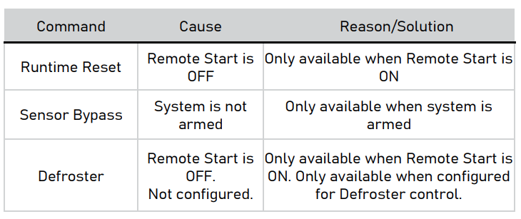 If the remote start command fails, the 2-Way remote will emit a ‘Remote Start Fault’ tone. Ensure that all point of entry zones are closed and that the alarm has not been triggered. If remote start commands continue to fail, see your Authorized Dealer.