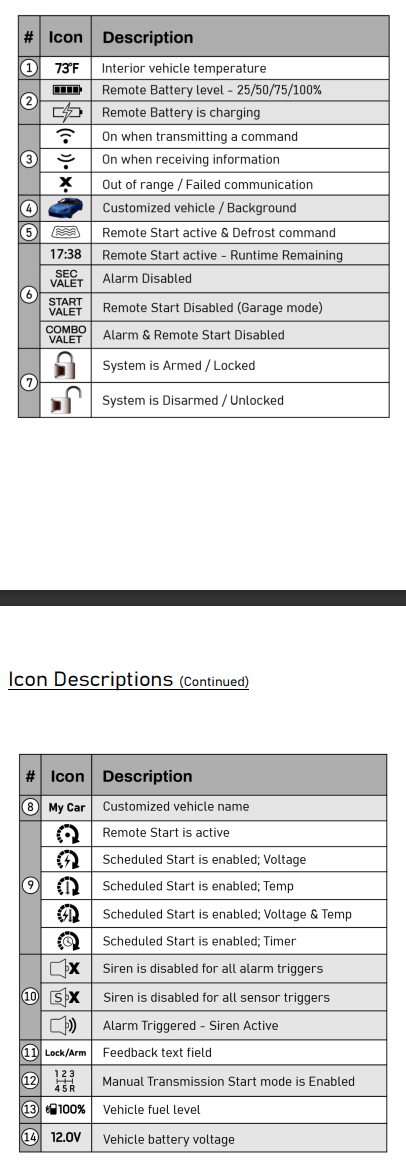 Valet modes can be entered and exited by performing remote commands or manually using the vehicle key and the control button. When entered, the applicable alarm/remote start functions are disabled while the convenience features still operate normally.
