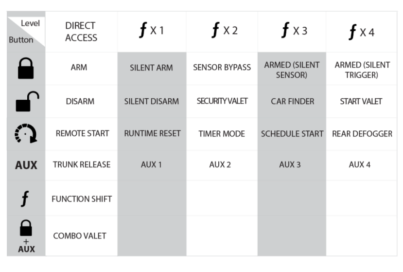 - Press function button two times for alarm valet or four times for garage mode (Remote start valet).