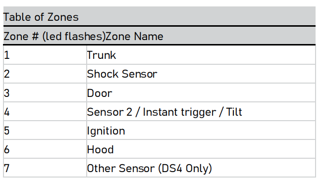 When armed by remote command the system runs a status check of the alarm trigger zones. Faulty zones (usually caused by dome light delay or open trunk) are bypassed and reported via the control center LED, while all other trigger zones remain active and are monitored to protect the vehicle. Should a faulty zone self correct (dome light turns off) it becomes active and is then monitored normally. The siren chirps once again a few seconds following the arming chirps as an audible alert, the control center LED flashes in groups to indicate the zone number.