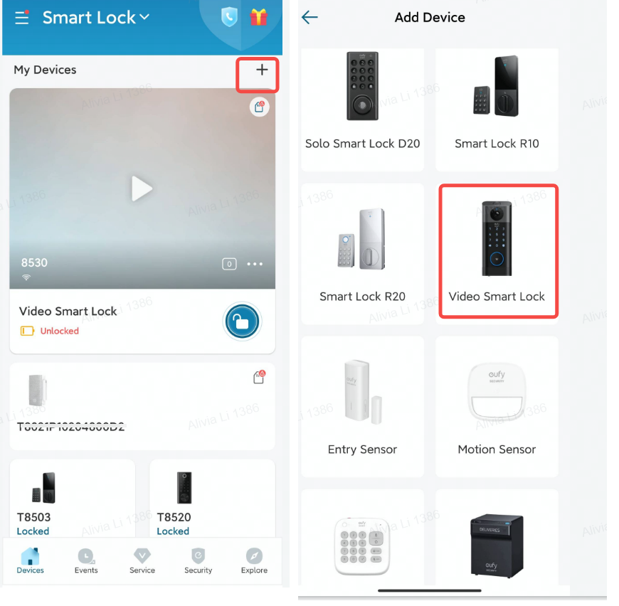 1. Tap the “+” icon to add a new device, and then select the Video Smart Lock.